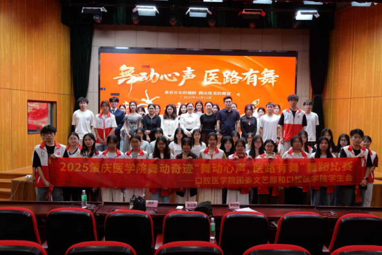 为了丰富同学们的校园文化生活,展示舞蹈爱好者的才华,促进舞蹈艺术的交流与发展,提高我院大学生综合素质与艺术修养,2025年11月12日晚,肇庆医学院口腔医学院于学术报告厅隆重举办“舞动心声,医路有舞”为主题的舞蹈大赛。出席本次大赛的有口腔医学院党支部负责人黄文专、辅导员尹同录、黄芹和团委副书记李泽杭、学生会主席吴欣婷等学生干部。
