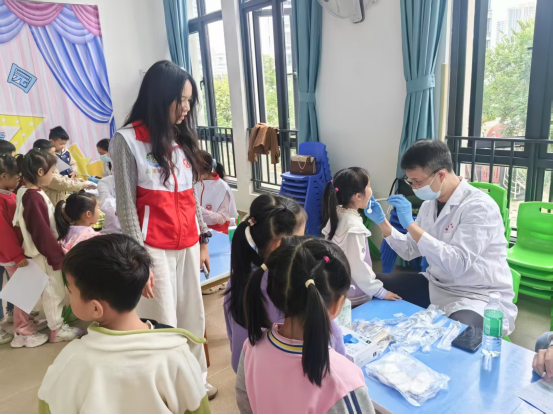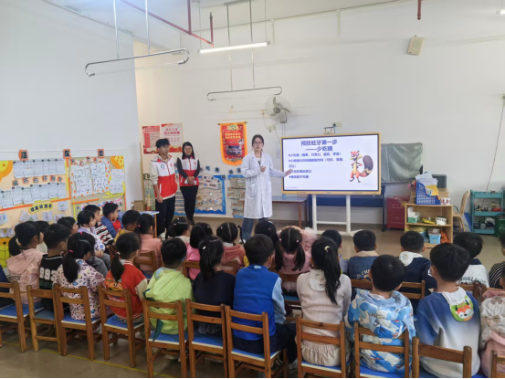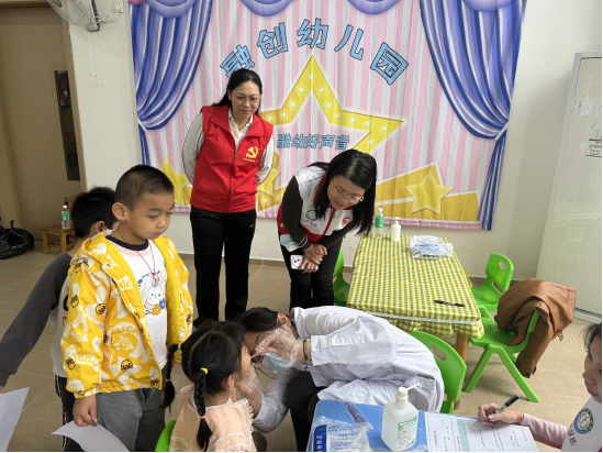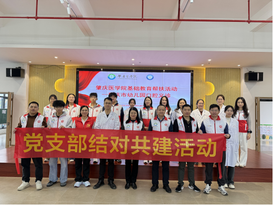为贯彻落实《广东省全口径全方位融入式帮扶粤东粤西粤北地区基础教育高质量发展实施办法》及《“健康中国2030”规划纲要》、《健康口腔行动方案(2019—2025年)》,推动肇庆市基础教育高质量发展,将优质的口腔医疗资源送到基层,提升学龄前儿童的口腔健康意识,2025年12月10日,口腔医学院党支部与机关第二党支部联合组织,到肇庆鼎湖融创幼儿园开展儿童口腔健康科普宣教与口腔检查公益活动。口腔医学院党支部、机关第二党支部党员志愿者参与此次活动,学校党委副书记邹云容、口腔医学院党支部负责人黄文专及院长黎祺亲临现场指导活动。